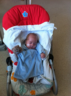 Another lovely thing happened today. We took the babies out for the first time! We were allowed to take them for a walk around the hospital grounds and I LOVED it! We had travel Oxygen cannisters in the pram and their sats monitors came with us too. Only the occassional beep beep beep but apart from that it was just amazing. We were like all the other parents you see every day pushing their babies around. I'd like to say that the boys loved it too but they spent the entire time fast asleep! The receptionists who we've seen every day for 3 months were so excited to see them! We're still not allowed visitors and it was just lovely to show them off to people - even if it was just the hospital receptionist! We'll try and get the grand parents to stand outside the hospital next weekend so they can see them. There will be so many tears!